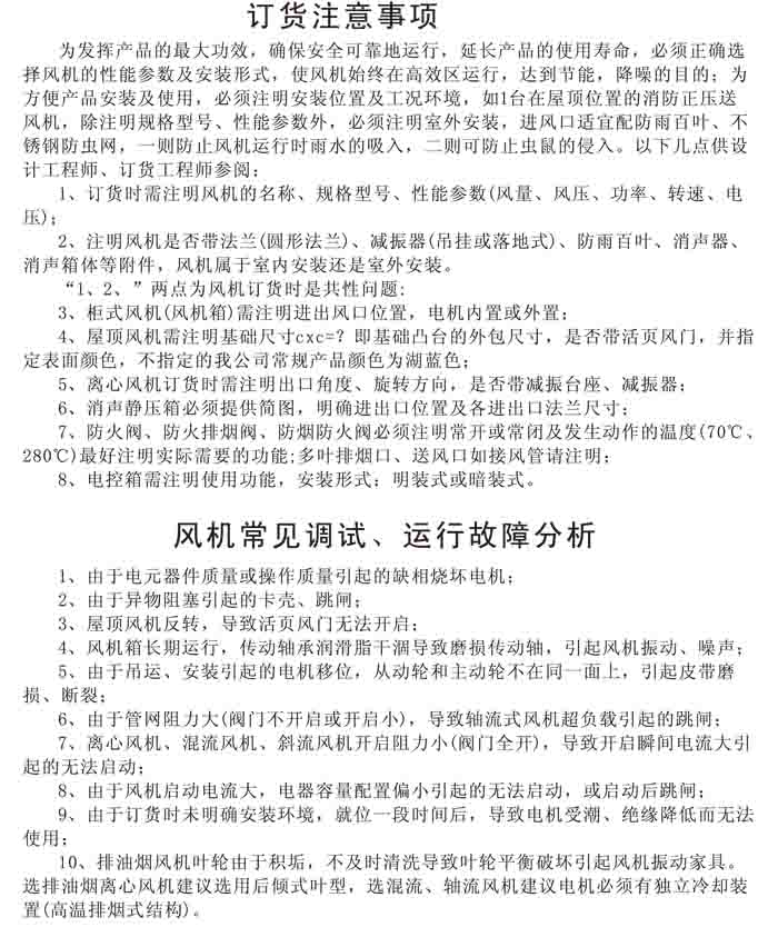 一、風(fēng)機(jī)選用參考、安裝維護(hù)使用說明、常見故障分析、訂貨注意事項(xiàng)